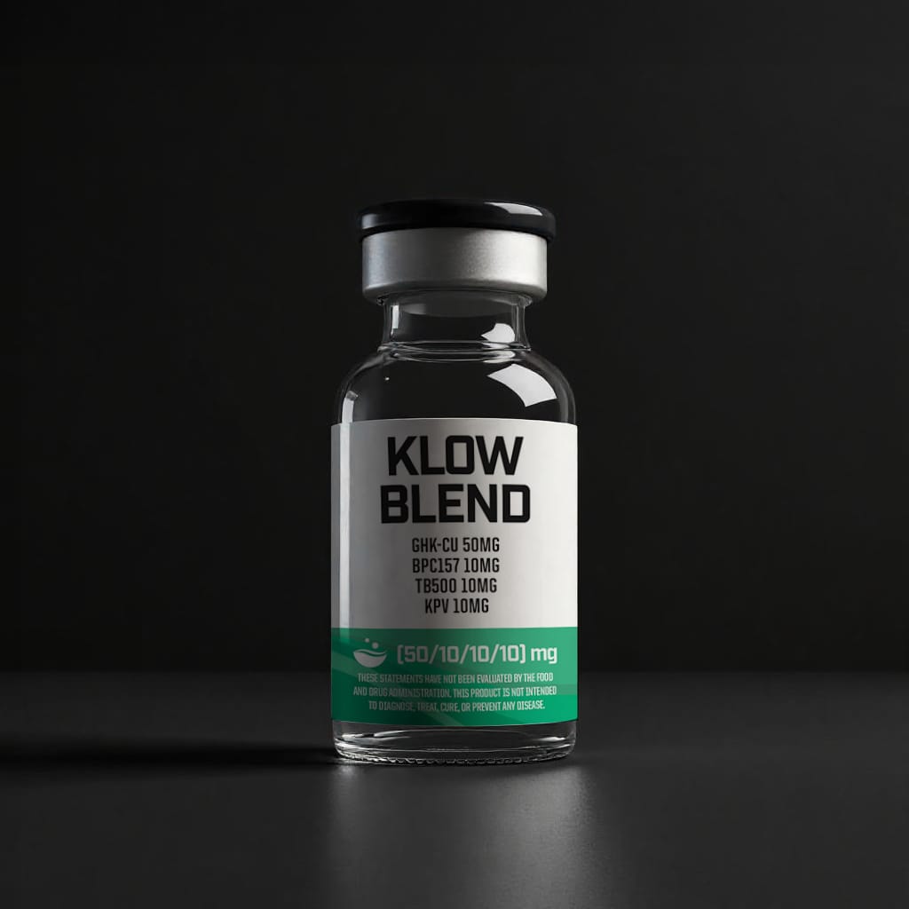 KLOW BLEND is a multi-peptide research formulation combining GHK-Cu, BPC-157, TB-500, and KPV, designed to support studies in tissue regeneration, cellular signaling, and inflammatory modulation. GHK-Cu is a copper-binding tripeptide studied for its role in wound repair and gene expression. BPC-157 and TB-500 are synthetic peptides commonly explored for their impact on angiogenesis, fibroblast activity, and cytoskeletal regulation. KPV, a tripeptide derived from α-MSH, is researched for its anti-inflammatory properties via melanocortin receptor pathways.